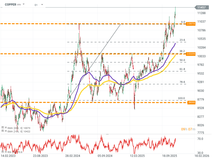 Měď pokračuje ve svém růstovém trendu a dosahuje nového historického maxima – nad úrovní 11 400 USD za tunu.
