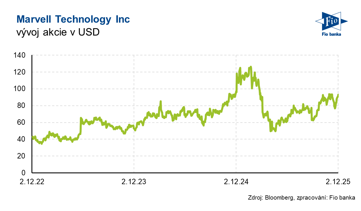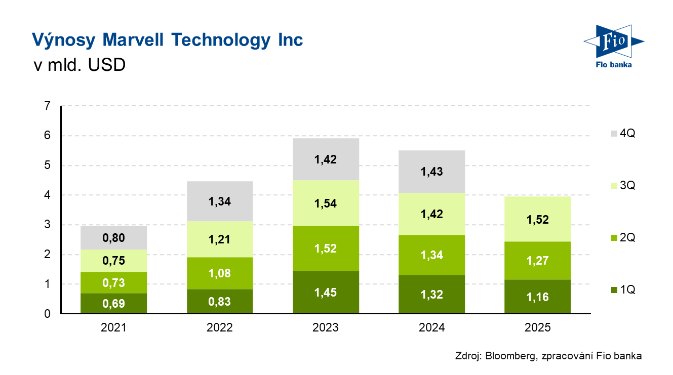 Klíčová slova: Analytik | Akcie | Akvizice | Bloomberg | Dividendový výnos | Marže | P/E | Ukazatel | Výnos | Zisk na akcii | USD | Obchodování | Zisk | Výsledky | EPS | Analytika | Banka | Fio banka | Cena | Fio | Signály | Cílová cena | Hrubá marže | ROCE | Ztráty | Kapitalizace | Výhled | Konsensus | Výnosy | Očekávání | Akcie společnosti | Čistý zisk | Hospodaření | Výsledky hospodaření | Komunikace | Trhy | Provozní zisk | Výdaje | Vývoj | Vývoj akcie | Technologie | AI | Společnosti | Společnost | Výsledky společnosti | 3М | Jakub Němec | Nová akvizice | Vice | Marvell Technology | Marvell | Technology | Očištěný zisk na akcii | Prodeje | Služby | Fio banka, a.s. | Akcie Marvell Technology | Akcie Marvell | Data centra |
