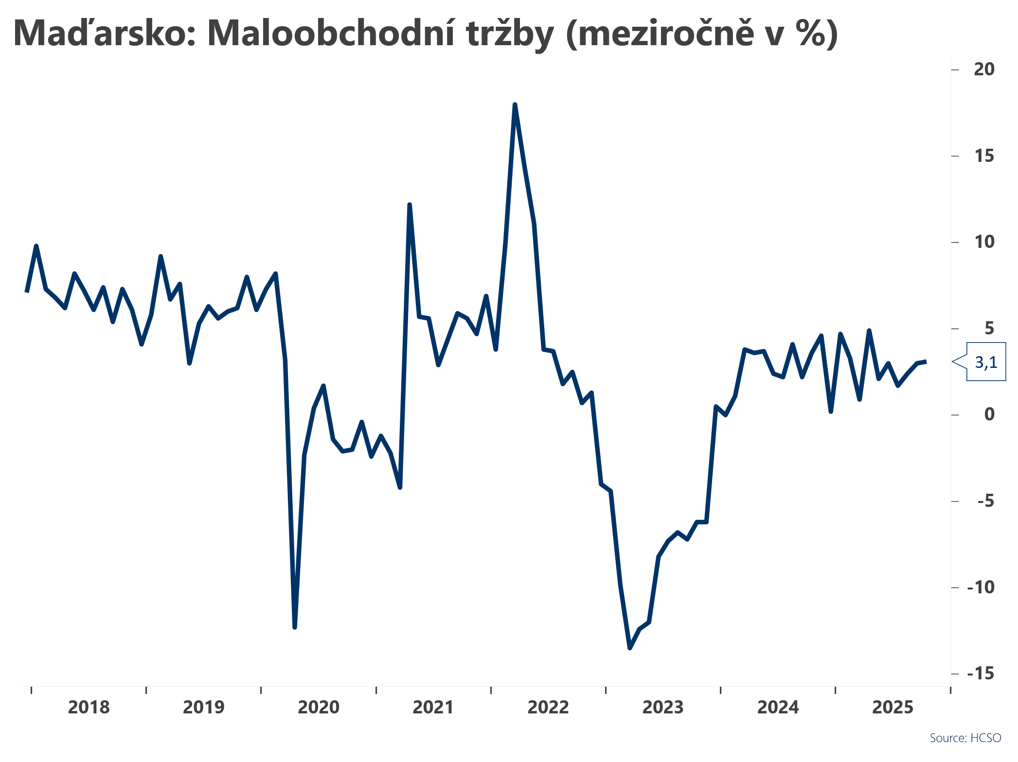 Maloobchodní tržby se v červenci snížily na 2,5 % meziročně oproti 2,6 % v červnu. Trhy naopak očekávaly růst na 3,1 % meziročně. -