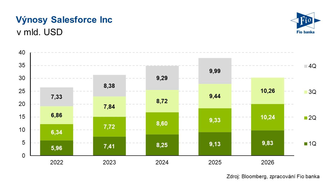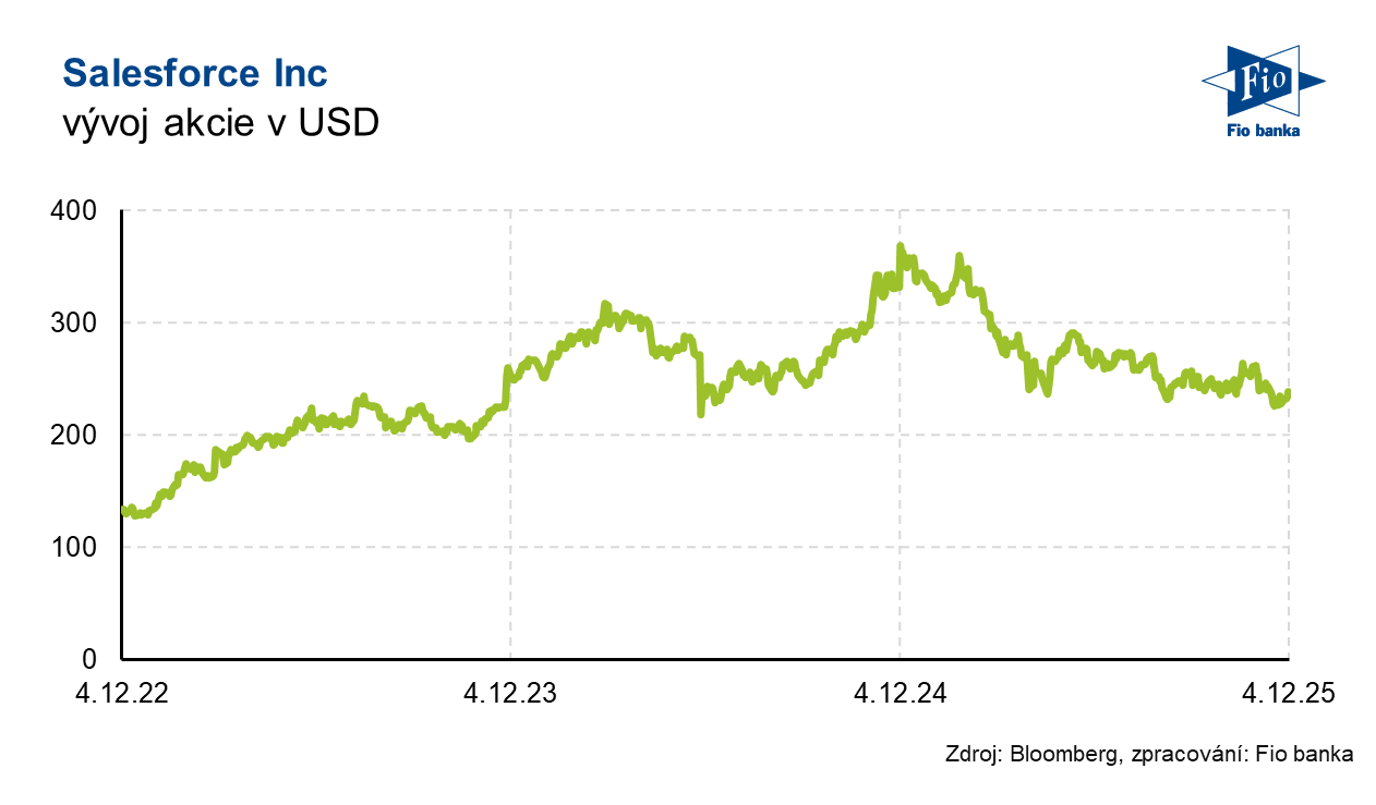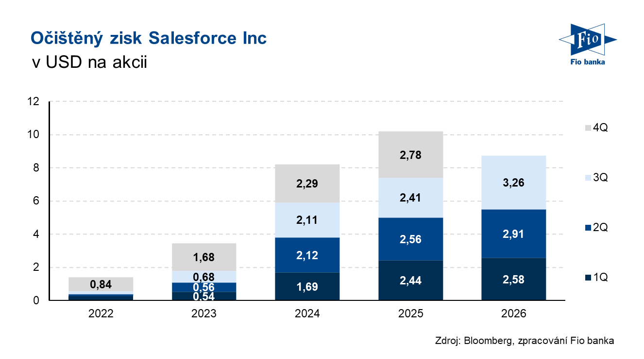Klíčová slova: Akcie | Akvizice | Bloomberg | Dividendový výnos | Marže | P/E | Ukazatel | Výnos | Zisk na akcii | Analytici | USD | Barclays | BNP Paribas | Zisk | Výsledky | EPS | Banka | Fio banka | Capital Markets | Cena | Fio | Fiskální rok | Markets | Cílová cena | Provozní marže | RBC Capital Markets | RBC Capital | Kapitalizace | Výhled | Konsensus | Výnosy | Očekávání | Akcie společnosti | Čistý zisk | Generální ředitel | Ředitelka | Hospodaření | Washington | Výsledky hospodaření | Meziroční růst | Vývoj | Růst | Údaje | Umělé inteligence | Salesforce | Akcie Salesforce | Vývoj akcie | CRM | Cíle | AI | Společnosti | RBC | Finanční ředitelka | BNP | Společnost | Výsledky společnosti | Celoroční výhled | 3М | Salesforce (CRM) | Akcie společnosti Salesforce | Přijetí | Vice | Komentář vedení | Akvizice společnosti | Capital | Platformy | Očištěný zisk na akcii | Fio banka, a.s. | Body | Michal Bárta | Volné hotovostní toky | Hotovostní toky | Marc Benioff |