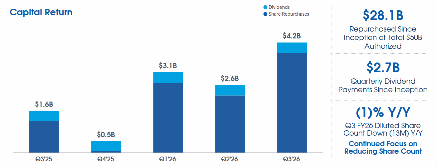 V průběhu třetího kvartálu společnost navrátila akcionářům 4,2 mld. USD. Z toho 3,8 mld. USD ve formě zpětných odkupů akcií a 395 mil. USD ve formě dividend.