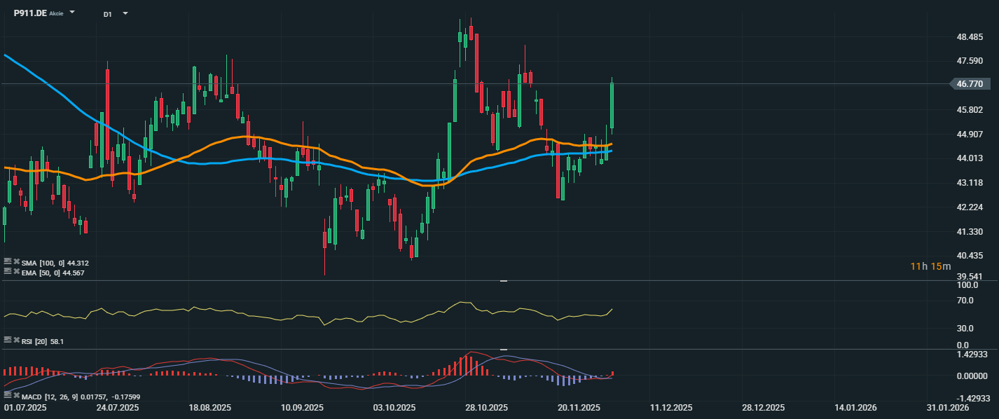 Akcie Porsche dnes předvedly silný růstový pohyb a aktuálně se obchodují na ceně 46,77 EUR, což představuje výrazné proražení nad důležité technické úrovně. Cena překonala klouzavé průměry EMA 50 (44,57 EUR) a SMA 100 (44,31 EUR), čímž vyslala býčí signál a naznačuje pokračování růstového trendu. RSI se posunulo na hodnotu 58,1, tedy se stále drží v neutrální zóně, ale s rostoucím momentem směrem k překoupenosti. Z pohledu síly nákupního zájmu tak stále existuje prostor pro další růst bez nutné korekce.