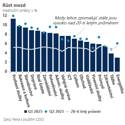 Průměrná mzda rostla ve třetím kvartále meziročně o 7,1 % a lehce zvonila tempo růstu ze 7,8 % (ve třetím kvartále). My jsme předpokládali lehce vyšší růst mezd (o 7,5 %), zatímco Česká národní banka v poslední prognóze kosmeticky nižší (7,0 %). Nejedná se tak o zásadní překvapení a my nadále předpokládáme, že zvýšená mzdová dynamika bude v Česku odeznívat jen velmi pozvolna – v tomto roce by mzda za celý rok měla v průměru růst o 7 % a v příštím o 5-6 %. K dlouhodobým průměrným tempům (4-5 %) se přiblíží pravděpodobně až v letech 2027-2028.