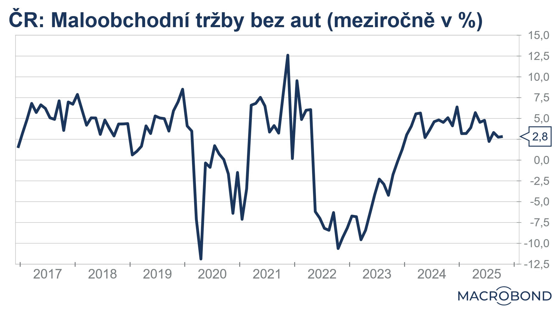 Data z maloobchodu potvrdila, že spotřeba domácností je v současnosti hlavním tahounem růstu české ekonomiky. Maloobchodní tržby bez prodejů motorových vozidel si meziměsíčně po sezónním očištění polepšily o 0,6 %, což bylo plně v souladu s naším předpokladem. Z meziročního pohledu to znamená, že rostly tempem 3,4 % po 3,8 % v únoru; březnový výsledek byl v podstatě v souladu s tržním konsensem ve výši 3,5 %. -