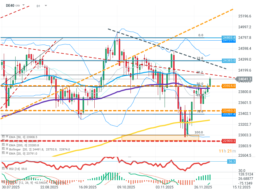 Německý index DAX v pondělí zaznamenal silný odraz vzhůru, když vzrostl přibližně o 1,6 % a prolomil hranici 24 000 bodů, a to jak na hotovostním indexu, tak na kontraktu DE40. K růstu došlo poté, co americký prezident Donald Trump oznámil, že odloží zavedení 50% cel na zboží z Evropské unie do 9. července. Rozhodnutí padlo po rozhovoru s předsedkyní Evropské komise Ursulou von der Leyen, která zdůraznila, že EU potřebuje více času k dosažení obchodní dohody s USA. -