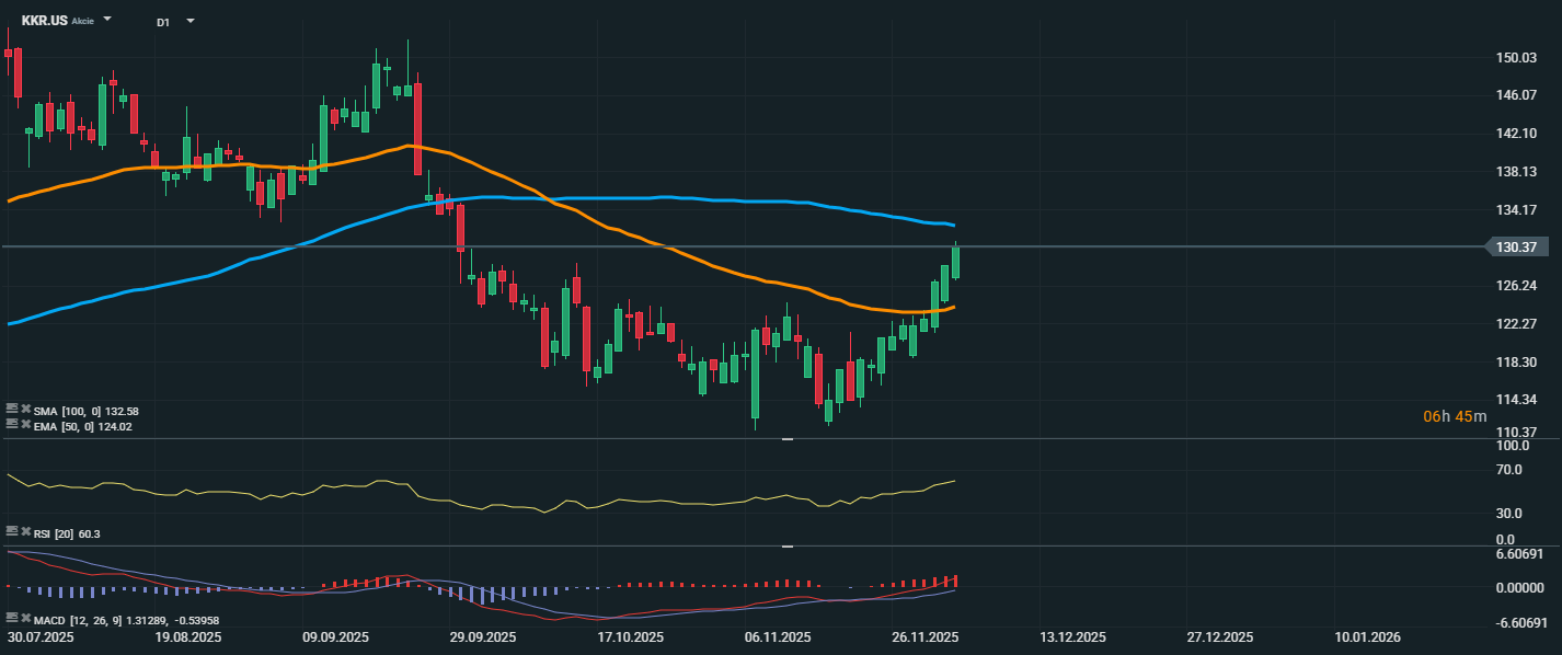 Akcie investiční společnosti KKR se aktuálně obchodují na hodnotě 130,37 USD, čímž se dostaly na úroveň blízkou klíčovému odporu v oblasti 132,50 USD, kde se nachází i 100denní klouzavý průměr (SMA 100). Akcie v posledních týdnech vykazují jasný obrat do růstového trendu, což potvrzuje průraz nad 50denní klouzavý průměr EMA (124,02 USD), který nyní slouží jako nejbližší podpora. RSI dosahuje hodnoty 60,3, tedy se nachází v neutrálním pásmu s mírným náznakem překoupenosti, což ale nadále poskytuje prostor pro pokračování růstu.