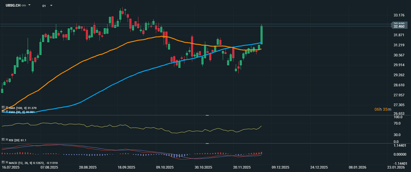 Akcie švýcarské banky UBS dnes zaznamenaly výrazný růst a uzavřely na ceně 32,46 CHF, což představuje prudký průraz nad klíčové klouzavé průměry – EMA 50 (30,98 CHF) a SMA 100 (31,38 CHF). Akcie nejenže prorazily dlouhodobé technické bariéry, ale zároveň se odrazily od předchozí konsolidační struktury s mimořádně silnou růstovou svící. RSI se aktuálně nachází na úrovni 61,1, což naznačuje silné nákupní momentum, ale stále bez překoupení.