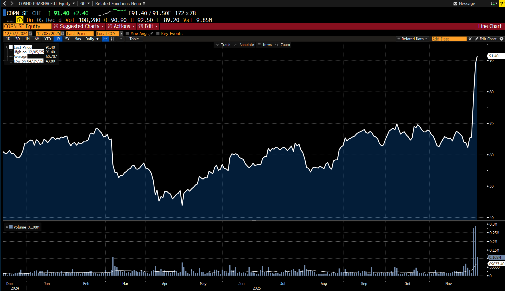 Akcie společnosti Cosmo Pharmaceuticals v tomto týdnu na švýcarské burze poskočily o zhruba 47 procent. Jedná se o největší nárůst v historii firmy, s jejímž akciemi se ve Švýcarsku obchoduje od března 2007. Tento pátek uzavřela akcie firmy na ceně 91,40 švýcarského franku, zatímco o týden dříve na úrovni 62,20 franku (viz vývoj akcií firmy v posledních dvanácti měsících na grafu Bloombergu níže). Důvodem rekordního nárůstu je středeční oznámení společnosti, že její přípravek pro boj s plešatěním mužů, který by znamenal největší průlom v dané oblasti léčby za více než třicet let, dosáhl v pokročilé fázi klinického testování mimořádně dobrých výsledků.