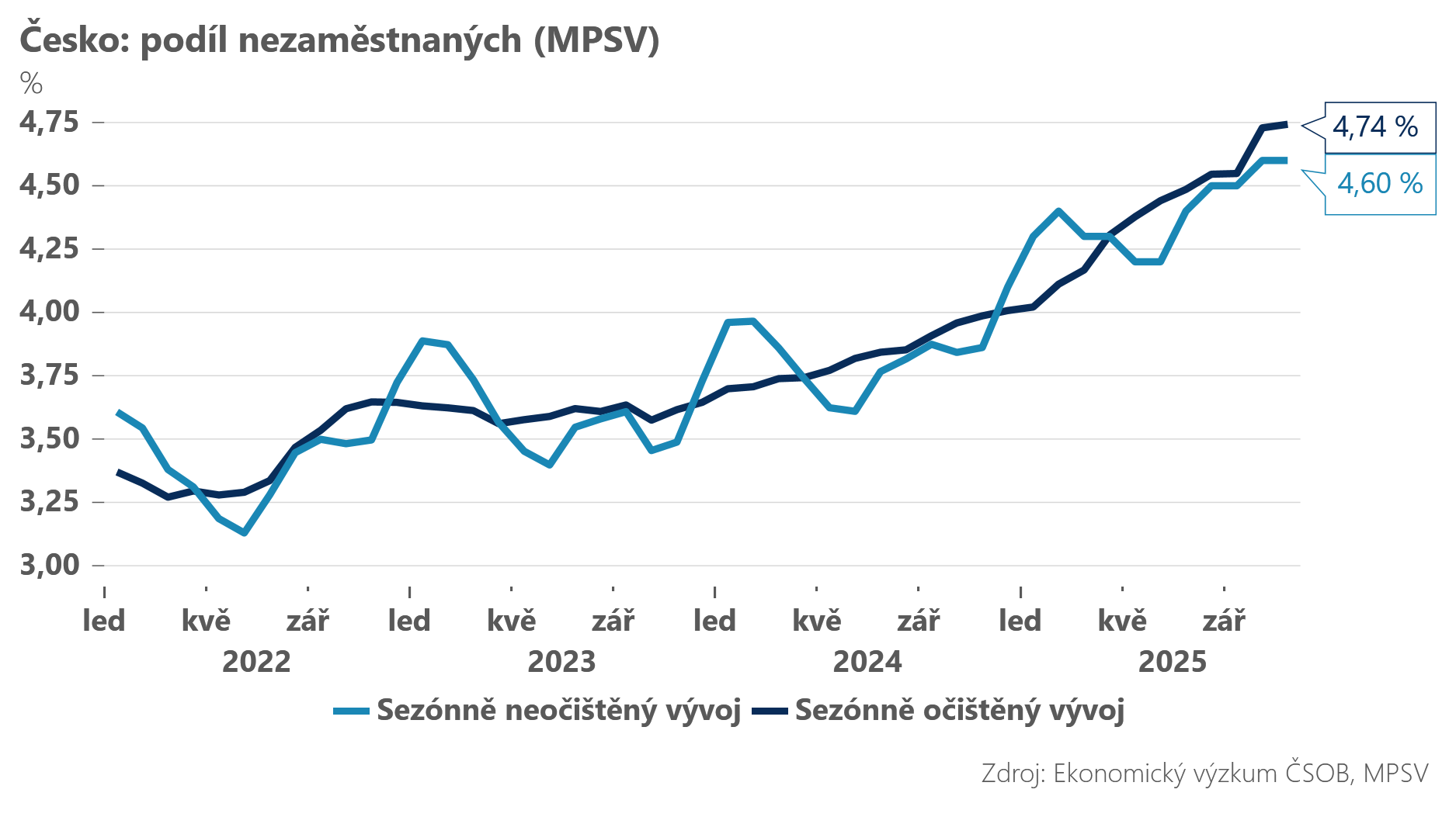 Podíl nezaměstnaných osob dle metodiky MPSV se v červenci zvýšil v souladu s očekáváním z 3,6 % na 3,8 %. Po sezónním očištění se podíl nezaměstnaných osob kosmeticky zvýšil na 3,9 %. V absolutních počtech vzrostl na úřadech práce počet nezaměstnaných o 10 tisíc na 283 tisíc, zatímco počet neobsazených pracovních pozic se snížil o 1,5 tisíce na 262 tisíc. -
