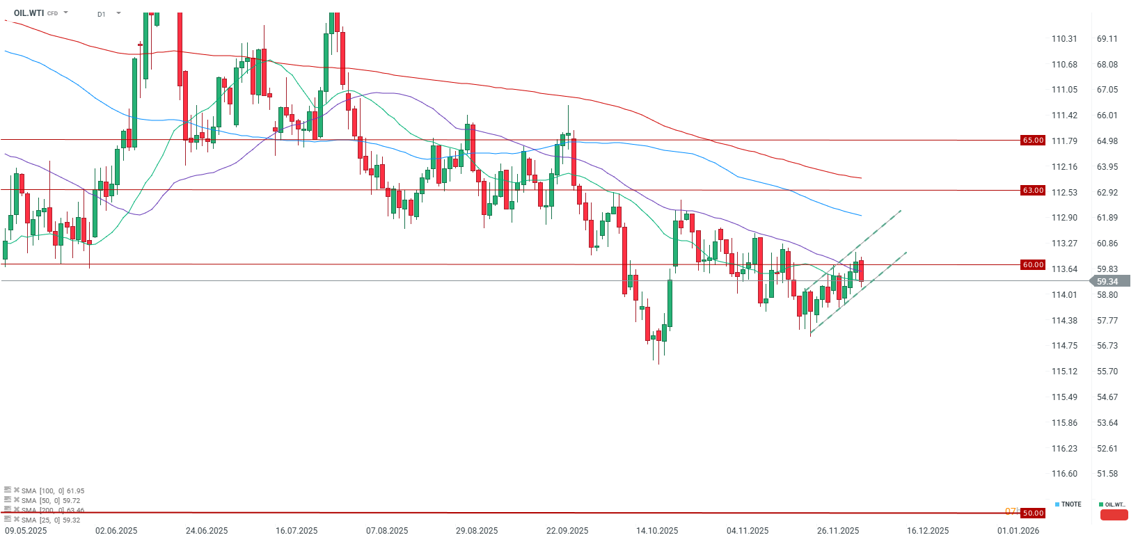 Z pohledu technické analýzy je třeba věnovat pozornost také vzestupnému trendovému kanálu. Dokud nebude prolomena jeho spodní hranice, je obtížné předpokládat, že ceny budou klesat směrem k nedávným lokálním minimům poblíž úrovně 57,5 USD za barel.