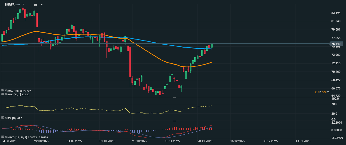 Akcie společnosti BNP Paribas se aktuálně obchodují na úrovni 76,44 EUR, čímž prorazily nad klíčové technické úrovně – jak nad SMA 100 (75,28 EUR), tak i nad EMA 50 (72,33 EUR). Tento průraz představuje pozitivní technický signál, který potvrzuje obnovený růstový trend po předchozí korekci. RSI dosahuje hodnoty 62,8, což značí rostoucí nákupní tlak, ale zároveň ještě nepřekročil překoupenou hranici (70), takže růst má potenciál pokračovat.