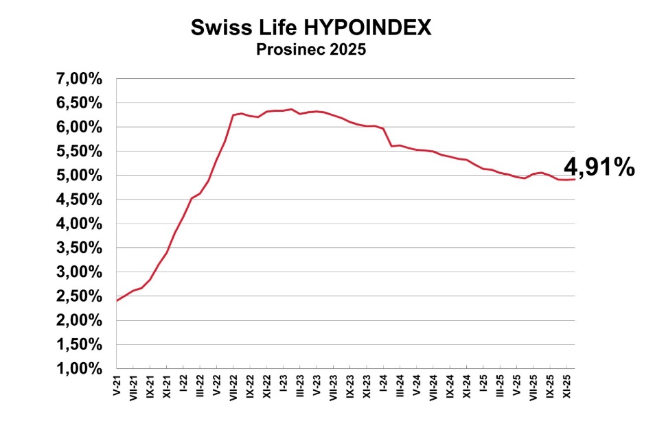 Pouze o tři desetiny procentního bodu letos klesly podle Swiss Life Hypoindexu úrokové sazby u hypotečních úvěrů. Loni přitom pokles činil osm desetin. Poslední měsíc roku nabídkové sazby stagnovaly a Swiss Life Hypoindex tak uzavírá rok 2025 na hodnotě 4,91 %. Během celého posledního čtvrtletí se sazby nepohnuly ani jedním směrem a zůstaly zamrzlé těsně pod pětiprocentní hranicí.