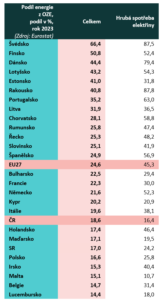 Zajímavé je, že v první desítce figurují i země střední a východní Evropy (region CEE), jako je Lotyšsko (43,2 %), Estonsko (41,0 %), Litva (31,9 %), Chorvatsko (28,1 %) a Rumunsko (25,8 %), které, přestože mají podobnou transformační historii jako Česko, naši zemi ve využívání OZE výrazně předstihly.