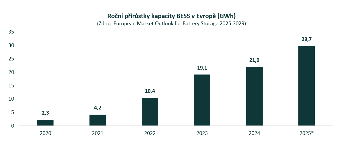 Pozn.: *střední scénář European Market Outlook for Battery Storage 2025-2029