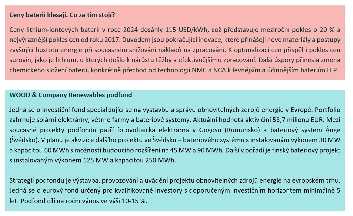 „Evropa je závislá na dalším rozvoji čisté energie. Bateriová úložiště začínají hrát klíčovou roli při zajišťování stability elektrické sítě. Bez baterií nemůžeme budovat další obnovitelné zdroje energie. Faktory, jako jsou klesající ceny materiálů, vylepšené chemické složení a zvýšená produkce, navíc dále zlepšují ekonomiku bateriových úložišť," říká Václav Kůla, který řídí podfond Renewables společnosti WOOD & Company.