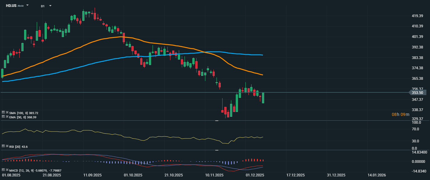 Akcie společnosti Home Depot se aktuálně obchodují na ceně 353,50 USD a po předchozím výrazném poklesu se snaží stabilizovat. Cena se nachází výrazně pod klouzavými průměry EMA 50 (368,39 USD) a SMA 100 (385,72 USD), což potvrzuje přetrvávající medvědí trend. RSI dosahuje hodnoty 43,6, což značí mírně oslabené momentum bez signálu přeprodanosti.