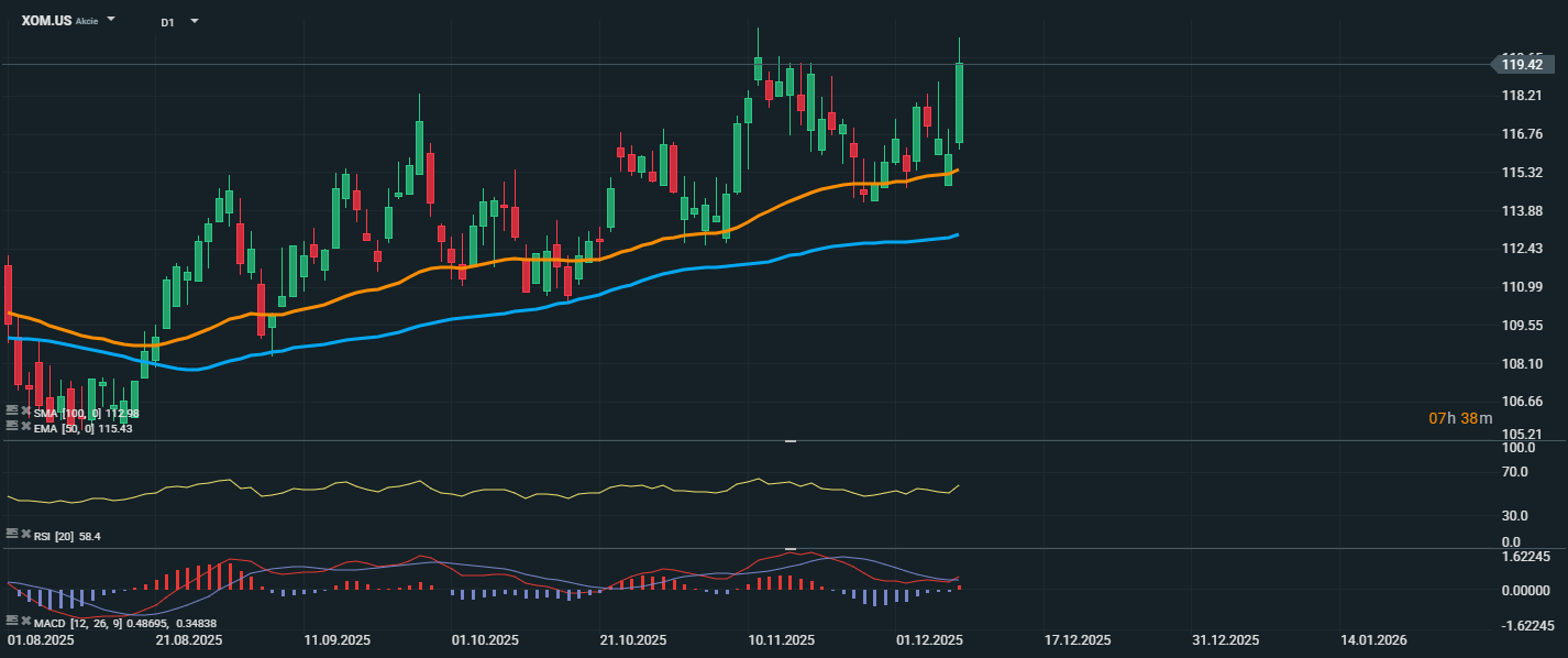 Akcie společnosti Exxon Mobil se aktuálně obchodují na úrovni 119,42 USD, přičemž dnešní silná býčí svíčka prorazila předchozí rezistenční zónu. Cena se nadále drží výrazně nad klouzavými průměry EMA 50 (115,43 USD) a SMA 100 (112,98 USD), což ukazuje na silnou podporu kupců. RSI dosahuje hodnoty 58,4, tedy v neutrální zóně s prostorem pro další růst bez známek překoupenosti.