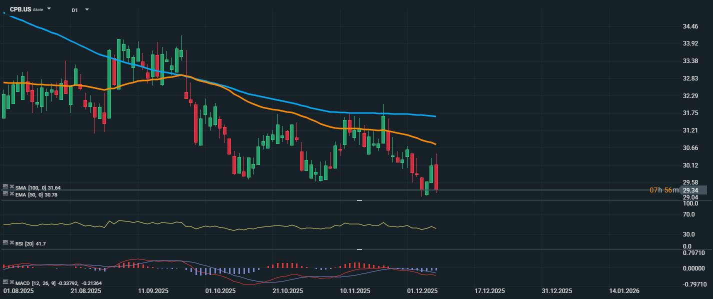Akcie společnosti Campbell Soup se aktuálně obchodují za 29,34 USD, tedy výrazně pod klouzavými průměry EMA 50 (30,78 USD) i SMA 100 (31,64 USD), což potvrzuje pokračující klesající trend. V posledních dnech došlo k pokusu o růst, ale odpor v oblasti 30 USD nebyl překonán a cena se vrátila zpět k předchozím minimům. RSI se nachází na hodnotě 41,7, tedy v pásmu slabého momenta, ale stále mimo přeprodanou zónu, což ukazuje na nejistotu mezi investory.