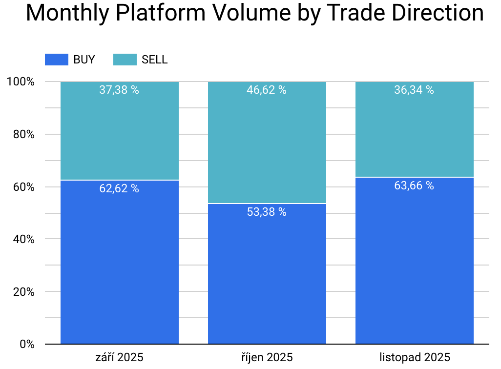 - Poměr nákupů a prodejů kryptoměn se oproti říjnovým 53 % výrazně vychýlil ve prospěch nákupů na 63,7 %.