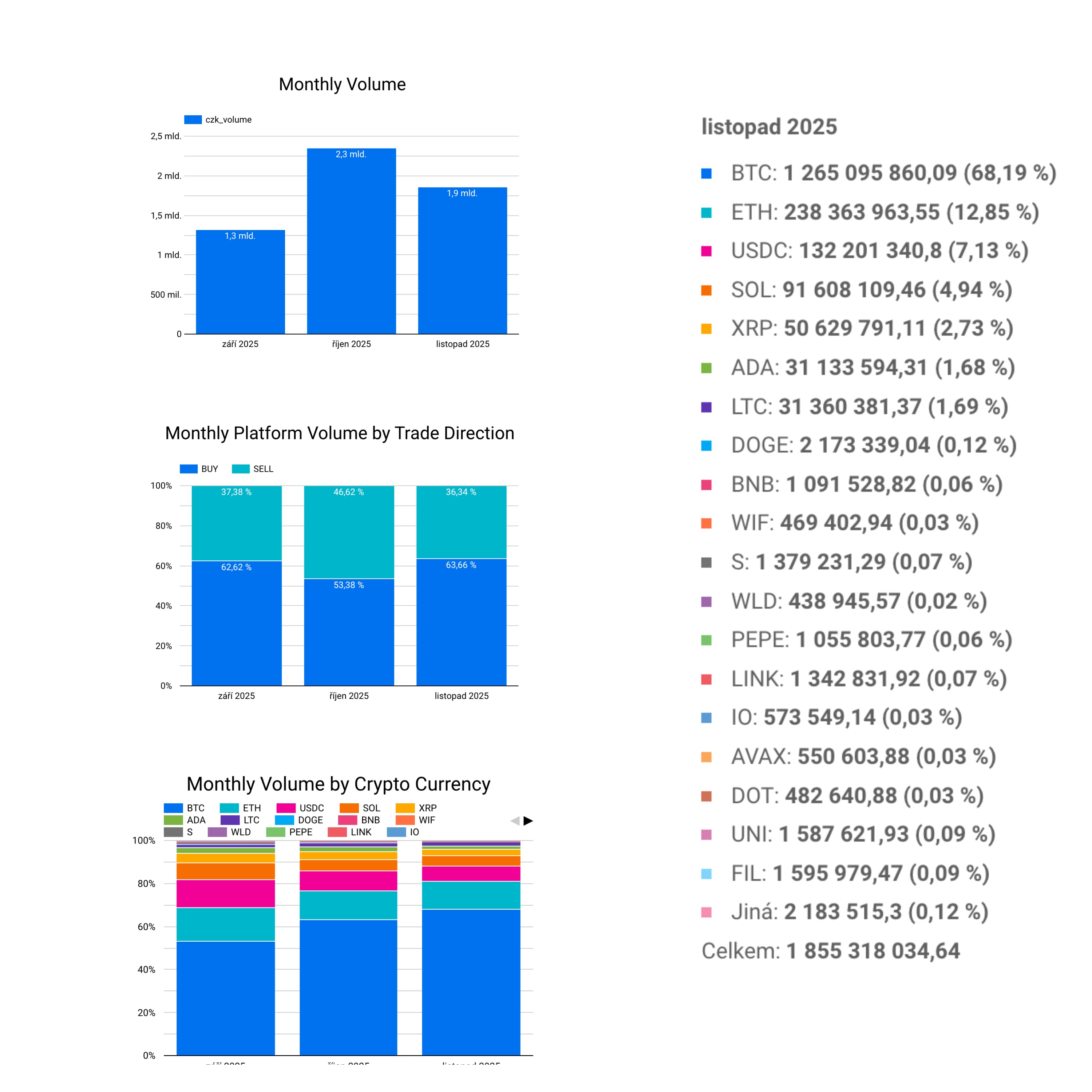- Dominance bitcoinu dále drtivě roste. V listopadu tvořil už 68,2 % celkového zobchodovaného objemu na burze, což je nárůst o 5 procentních bodů oproti říjnu.