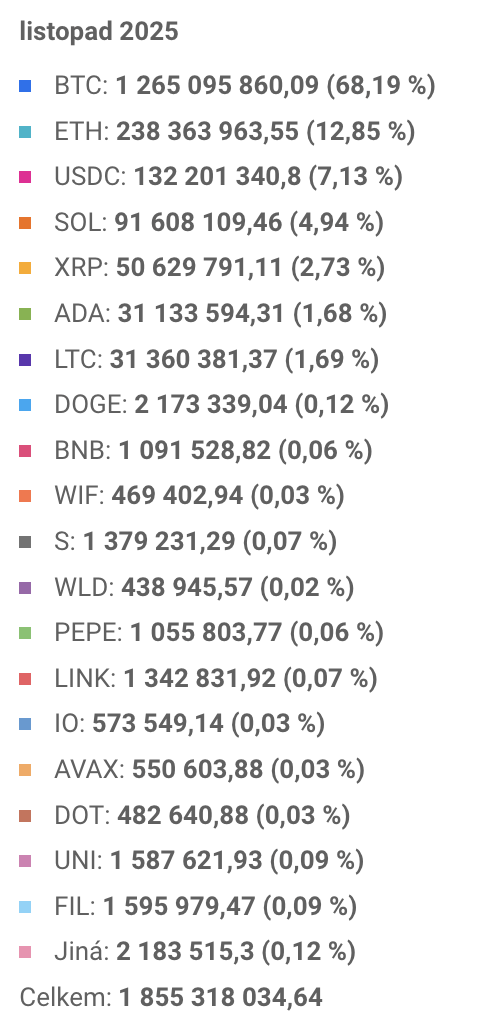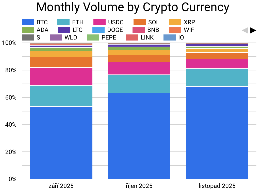 „Listopadová data nám vykreslují poměrně jasný obraz trhu. Investoři totiž přestali spekulovat a začali výrazně akumulovat. Ačkoliv celkový objem obchodů oproti rekordnímu říjnu mírně klesl na 1,9 miliardy, nákupní tlak naopak citelně zesílil. Poměr nákupů vystřelil na téměř 64 %, což je pro nás jasný signál, že trh vnímá aktuální cenu jako příležitost k levnějšímu nákupu a k dlouhodobému držení. Absolutním vítězem je bitcoin, který si ukousl téměř 70 % všech obchodů. Tento růst jde na úkor prakticky všech ostatních aktiv včetně Etherea. Investoři se tak v nejistých časech zkrátka vracejí k jistotě,” komentuje Martin Košťál, CGO Coinmate.