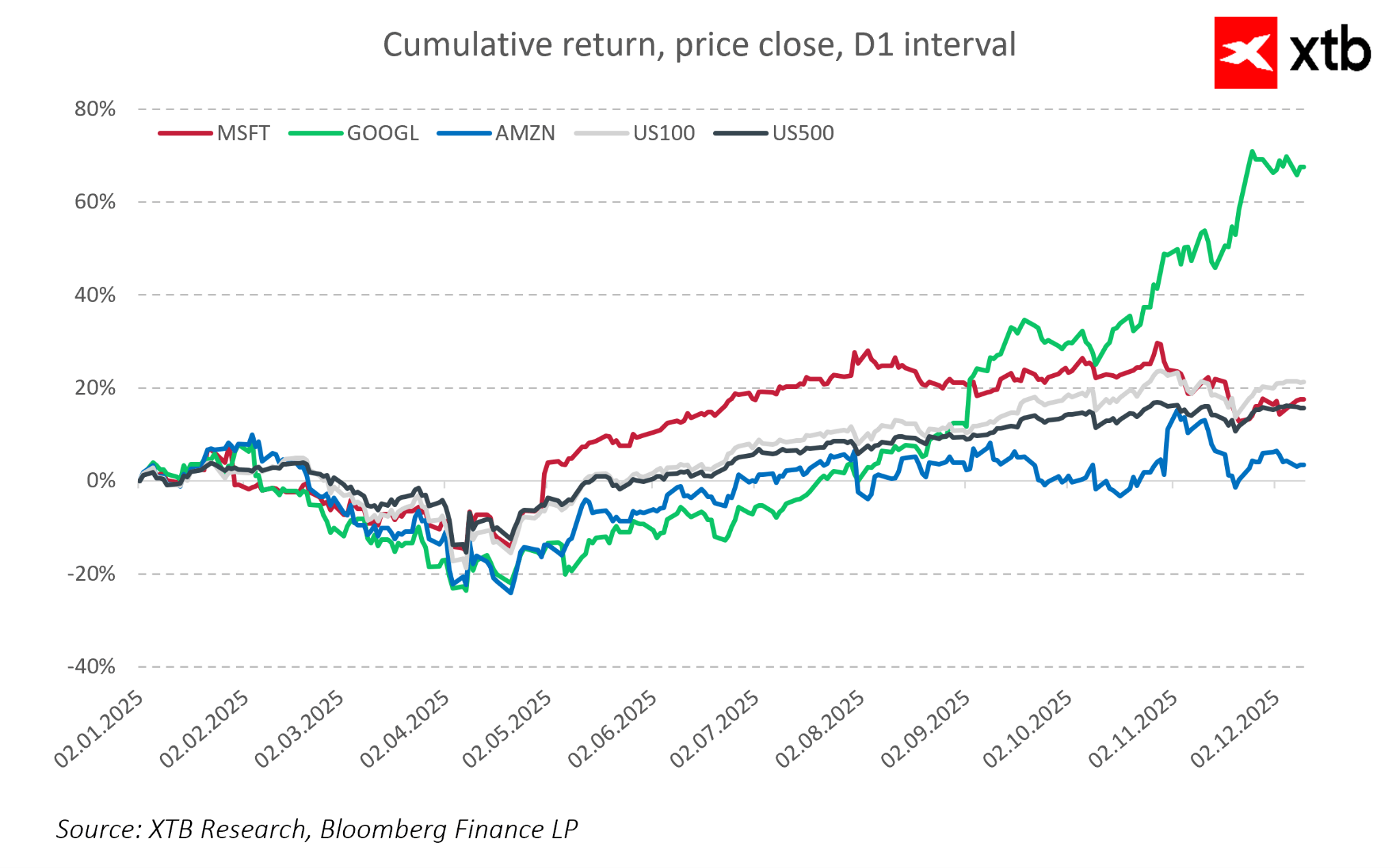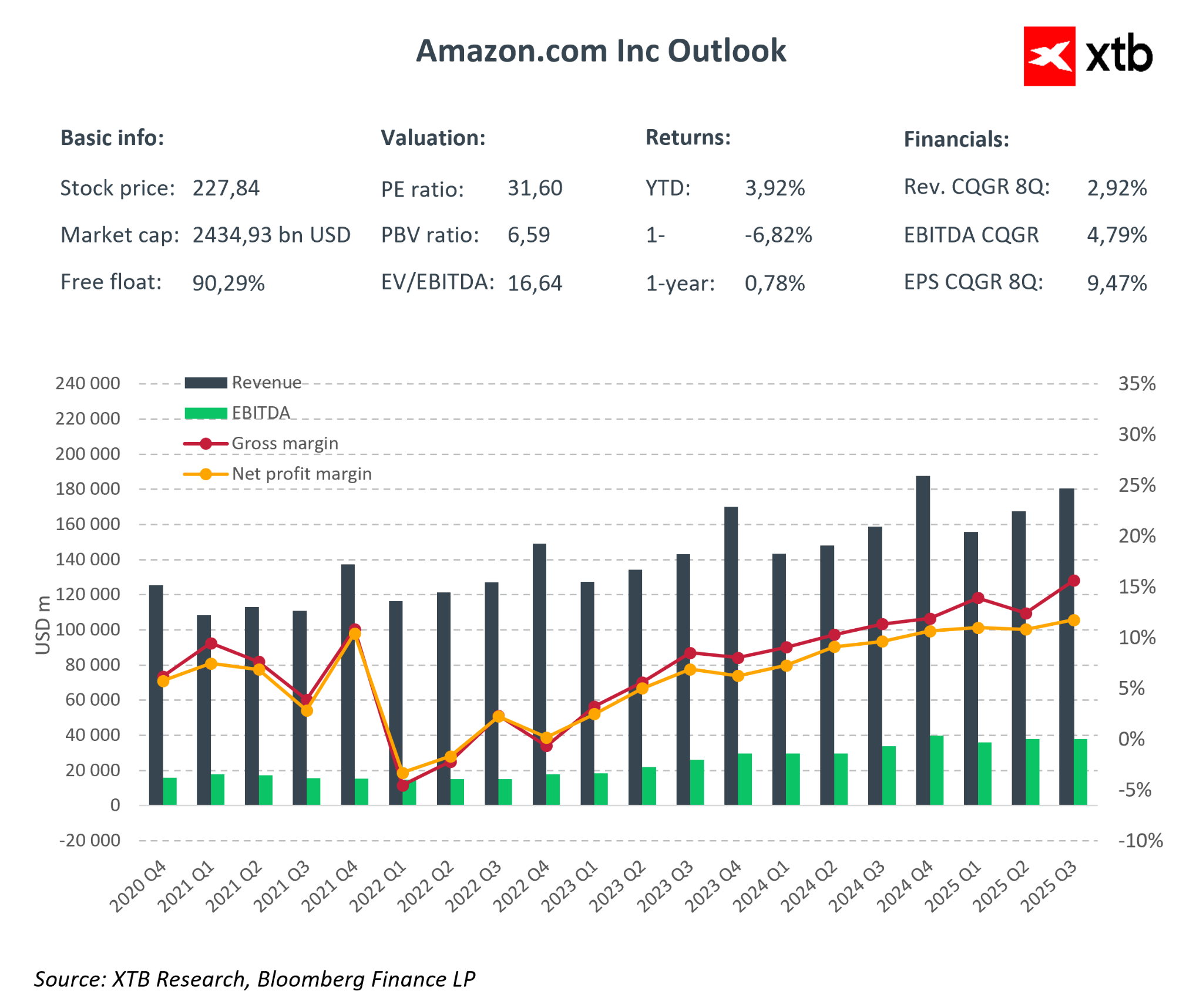 Amazon výrazně zvyšuje své aktivity v Indii a připojuje se k Microsoftu a Googlu při budování globálního centra pro umělou inteligenci a cloudové služby. To představuje pro Amazon katalyzátor růstu tržeb, ale také s sebou nese vysoké kapitálové výdaje a regulační riziko. Stojí za zmínku, že v letošním roce společnost zaznamenala relativně nízkou návratnost ve srovnání s jinými velkými technologickými hráči a hlavními indexy, jako jsou S&P 500 a Nasdaq 100.