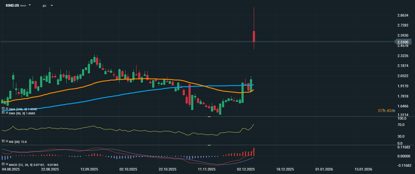 Akcie Nextdoor Holdings zaznamenaly prudký pohyb vzhůru a aktuálně se obchodují na úrovni 2,51 USD, což představuje skokový nárůst o téměř 50 % během jediného dne. Cena prorazila nad obě klíčové technické úrovně – EMA 50 (1,87 USD) i SMA 100 (1,93 USD) – a současně uzavřela vysoko nad těmito průměry, což potvrzuje změnu trendu z medvědího na býčí. RSI se nachází na hodnotě 72,8, což značí vstup do překoupeného pásma, a může indikovat možnost krátkodobé korekce.