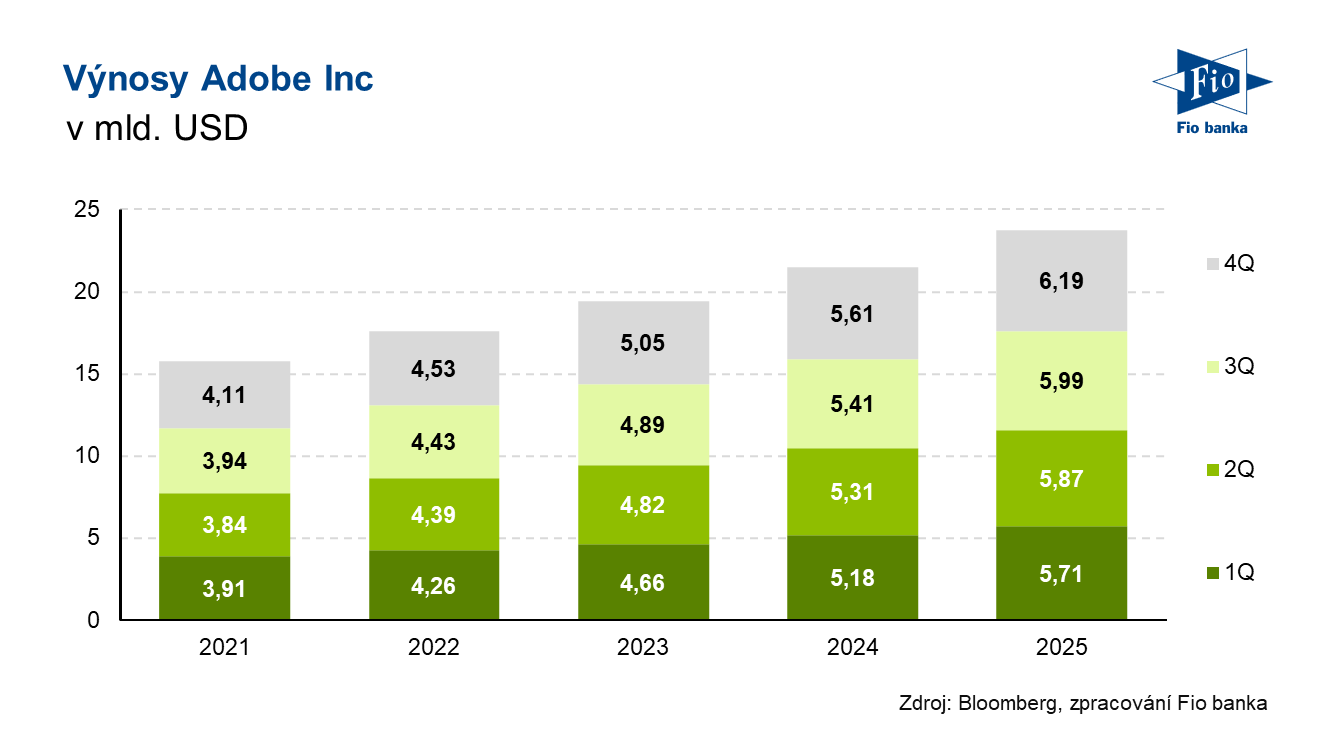 Americká softwarová společnost Adobe zveřejnila výsledky hospodaření za čtvrtý kvartál 2025. Výnosy meziročně vzrostly o 10 % na 6,19 mld. USD při očekávání 6,11 mld. USD. Rovněž očištěný zisk na akcii překonal očekávání, když dosáhl 5,5 USD. Trh predikoval 5,39 USD. Společnost uveřejnila výhled na následující kvartál a celý fiskální rok 2026.