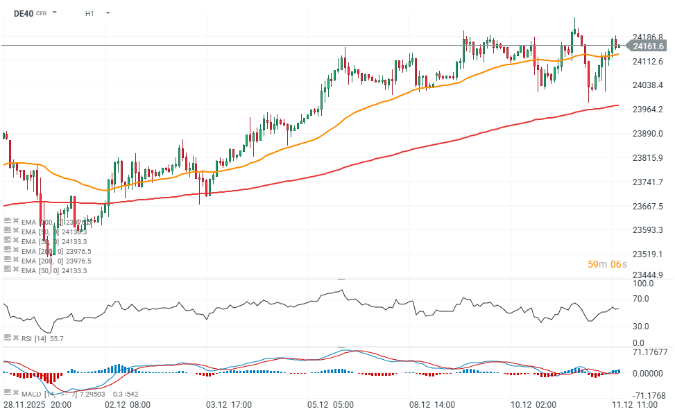 Dnešní evropskou obchodní seanci vedou kupci, přičemž německý peněžní index DAX vzrostl o téměř 1 %. Futures kontrakty posilují o více než 0,6 % nad úroveň 24 400 bodů a posunuly se nad exponenciální klouzavý průměr 50 (EMA50). Údaje o německé inflaci dopadly v souladu s prognózami. -