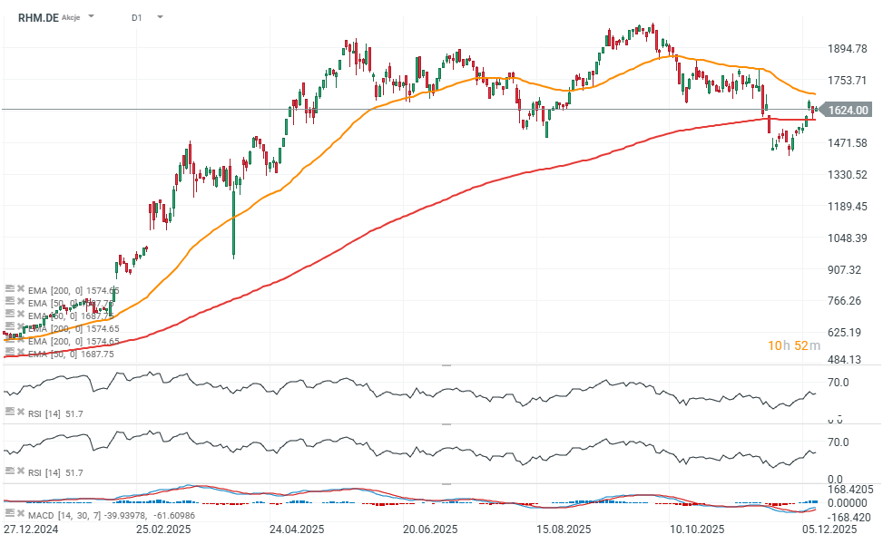 Německý akciový trh opět ukazuje odolnost – účinně odolává prodejnímu tlaku. Index DAX smazal část předchozích ztrát a aktuálně klesá pouze o 0,18 %, zatímco futures na DE40 mírně rostou v rozmezí 0,3–0,4 % před zveřejněním klíčových makroekonomických údajů z USA (zpráva NFP ve 14:30). Pokles německých obranných akcií, jako jsou Rheinmetall, RENK a Hensoldt, je zřejmě způsoben především vybíráním zisků po předchozím růstu. -