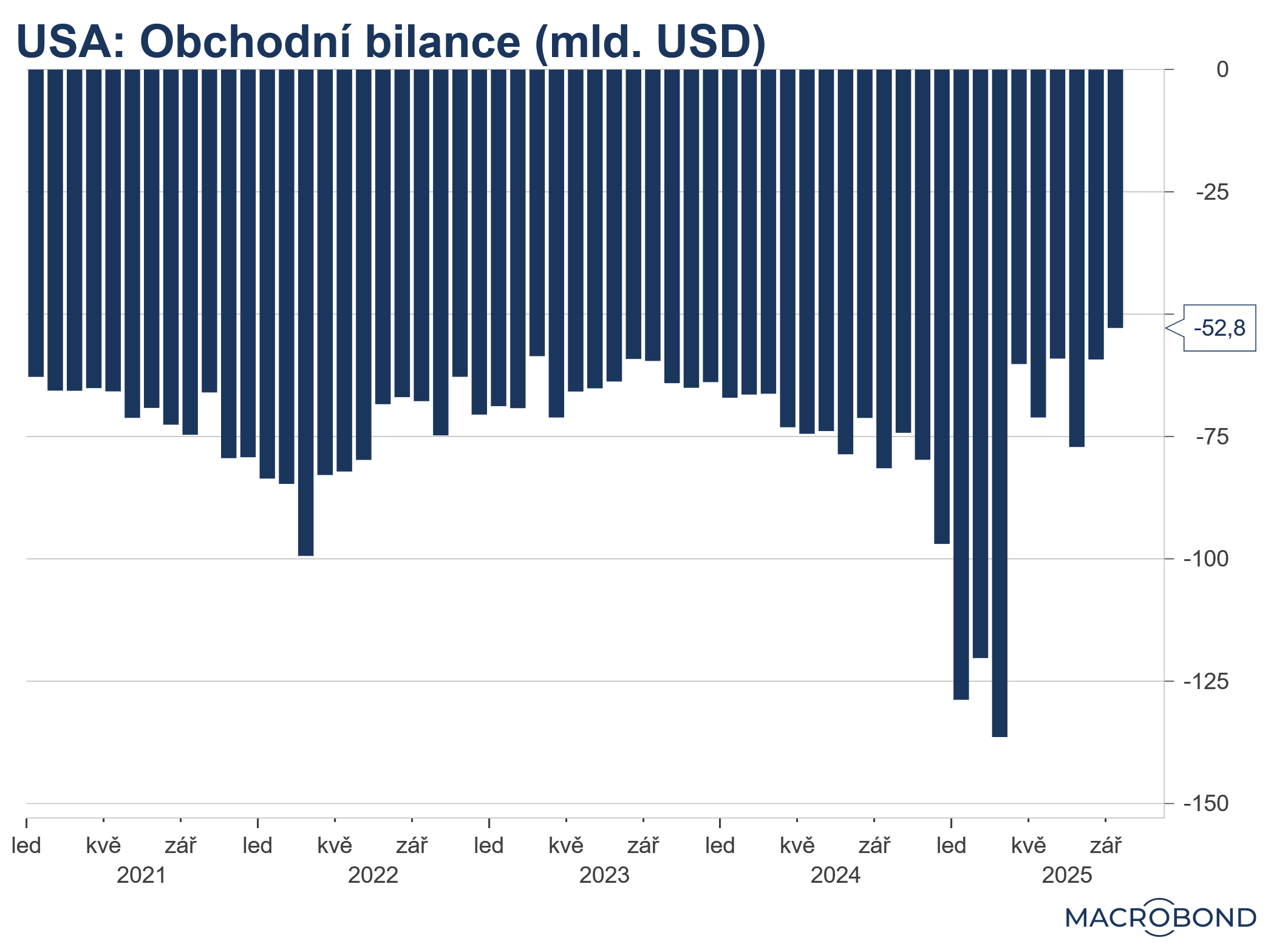 Americký deficit zahraničního obchodu v září 2025 dosáhl 52,8 miliardy USD, což představuje zlepšení oproti revidovanému srpnovému deficitu ve výši 59,3 mld. USD. Trhy očekávaly deficit ve výši 63,1 mld. dolarů.