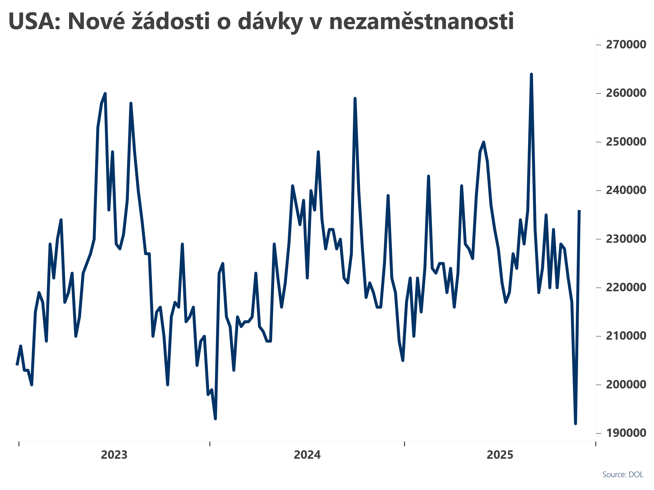 Počet nových žádostí o dávky v nezaměstnanosti v minulém týdnu stoupl na 236 tis. oproti revidovaným 192 tis. v předminulém týdnu. Trhy očekávaly růst na 220 tis. nových žádostí.