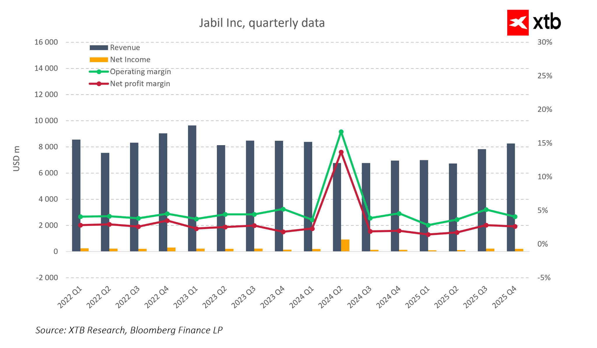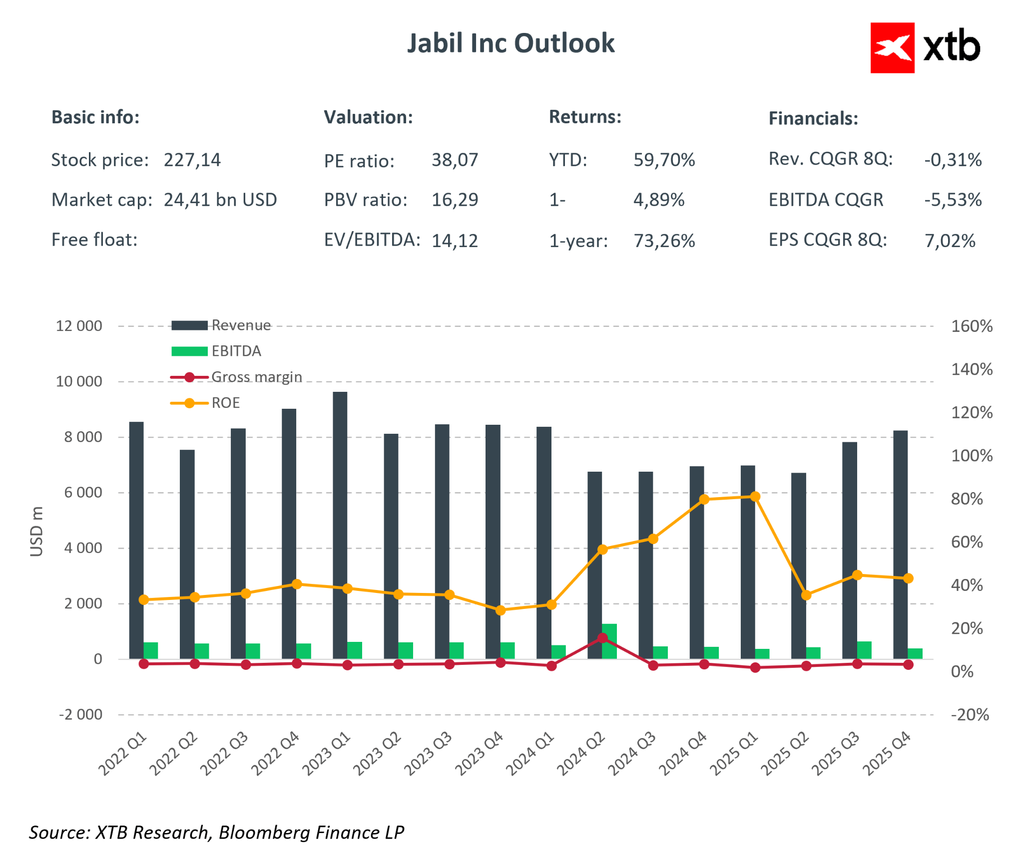Jabil Inc. je globální poskytovatel smluvní výroby elektroniky, který obsluhuje přední světové technologické značky. Společnost těží z rostoucí poptávky po infrastruktuře datových center, umělé inteligenci a průmyslové elektronice, což vytváří pevný základ pro další růst.