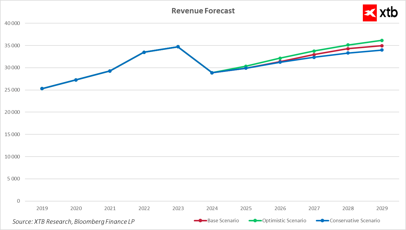 Konzervativní scénář počítá s pomalejším růstem, při kterém tržby v roce 2026 dosahují 31,24 miliardy USD a do roku 2029 rostou na 33,97 miliardy USD. Tento vývoj reflektuje možné zpomalení poptávky v některých segmentech nebo omezení v dodavatelských řetězcích. I při pomalejším růstu však společnost udržuje stabilní ziskovost a nákladovou disciplínu, což jí umožňuje generovat cash flow a investovat do strategických oblastí.