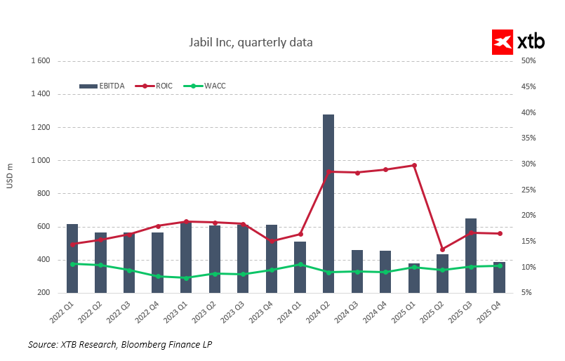 Poměr mezi vytvořeným EBITDA, návratností investovaného kapitálu (ROIC) a náklady kapitálu (WACC) je rovněž pozitivní. ROIC dlouhodobě převyšuje WACC, což znamená, že každá další jednotka investovaného kapitálu vytváří hodnotu nad rámec nákladů na financování. Jabil tedy nejen roste, ale zároveň vytváří skutečnou hodnotu pro akcionáře.