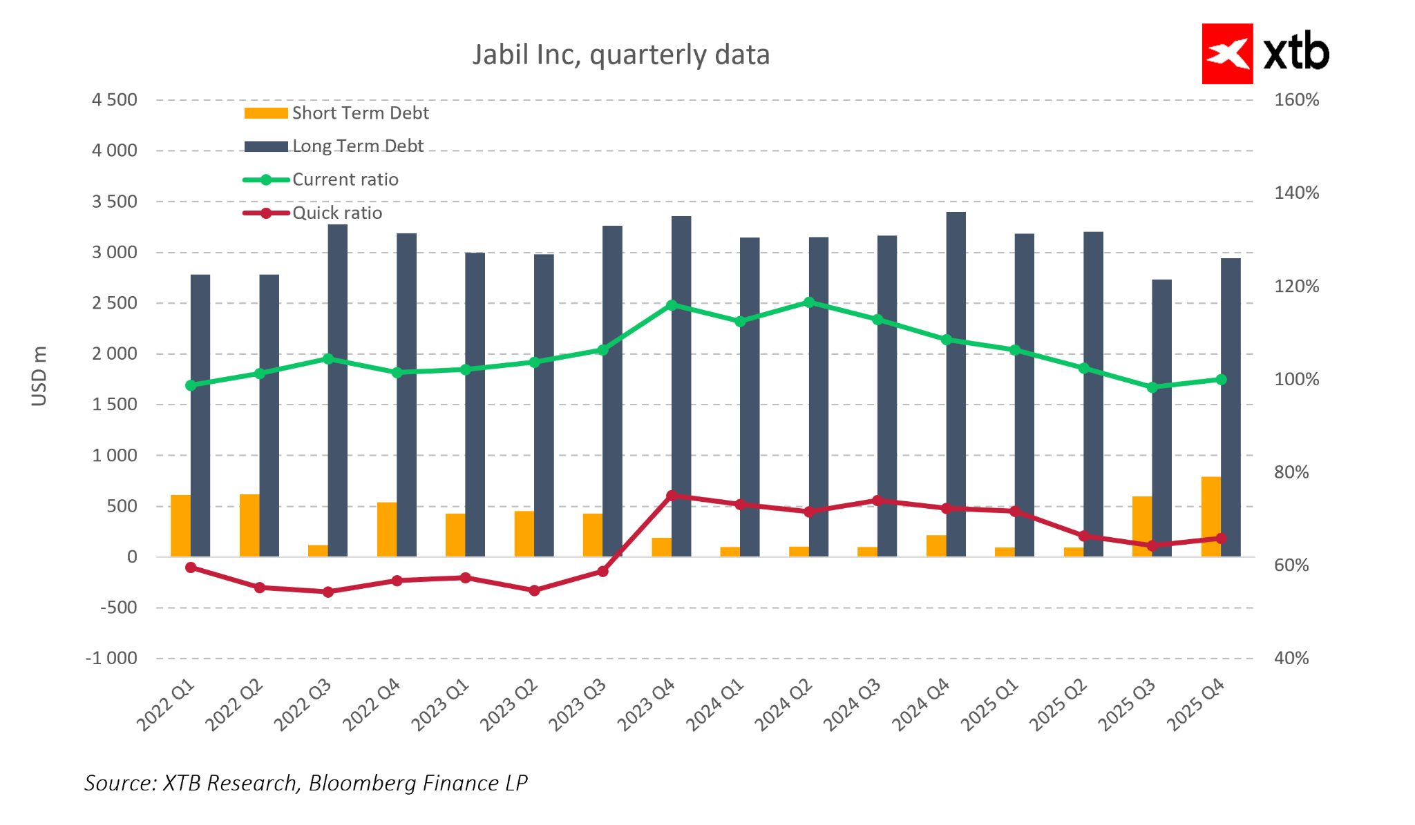 Struktura zadlužení ukazuje, že Jabil vstupuje do další fáze investic se zdravou rozvahou. Dlouhodobý dluh se drží mezi 2,7–3,3 miliardy USD, zatímco krátkodobý dluh se v posledních čtvrtletích mírně zvýšil, ale ze velmi nízké základny. Current ratio zůstává bezpečně nad úrovní 1,0 a quick ratio se oproti letům 2022–2023 zlepšilo, což naznačuje, že firma financuje strategický růst v oblastech AI a datových center z pozice silné likvidity.