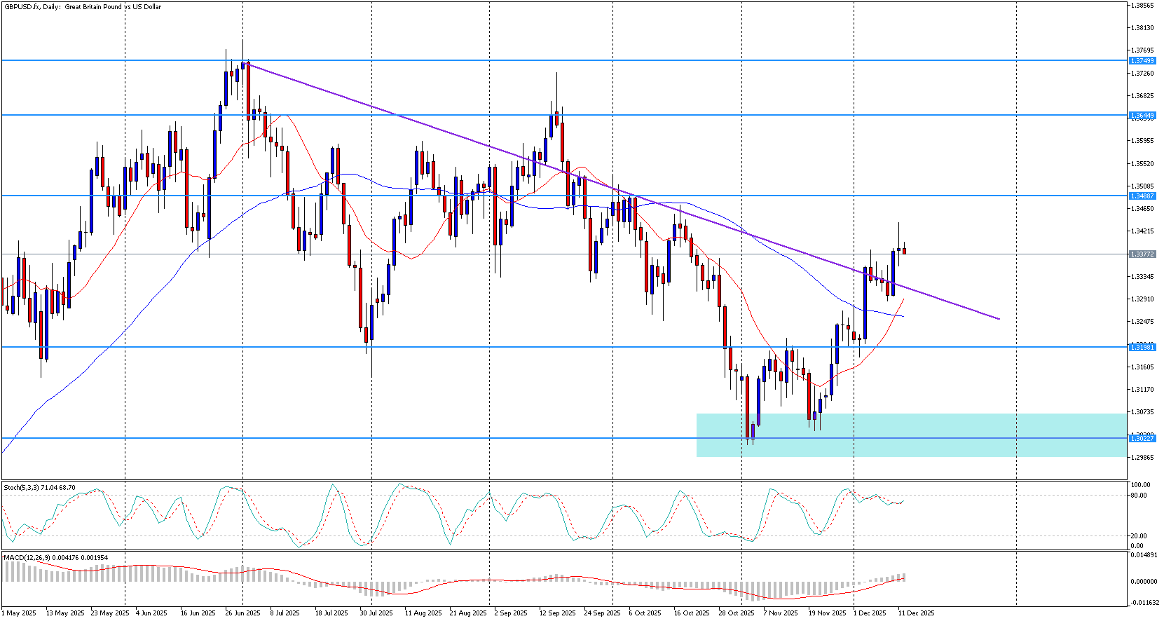 Měnový pár GBP/USD se přiblížil k hranici 1,3400, přičemž růst byl podpořen především plošným oslabením amerického dolaru a slábnoucími očekáváními dalšího uvolňování měnové politiky Bank of England v roce 2026. Dodatečný impuls přineslo rozhodnutí amerického Fedu, který podle očekávání snížil úrokové sazby a zároveň naznačil možnou pauzu v lednu, jelikož tvůrci politiky vyčkávají na další klíčová makroekonomická data. Z technického pohledu je pohyb páru významný zejména tím, že cena prorazila dlouhodobou klesající trendovou linii a zároveň se dostala nad 200denní jednoduchý klouzavý průměr. Tyto průlomy posilují střednědobou býčí strukturu a zvyšují pravděpodobnost pokračování růstu. Rozhodující uzavření nad úrovní 1,3400 by tento scénář dále potvrdilo a mohlo by otevřít prostor pro další posun výše. V případě oslabení by však návrat pod hladinu 1,3310 mohl znovu zhoršit sentiment. Takový vývoj by nasměroval cenu nejprve k úrovni 1,3260, kde se nachází 50denní SMA, a následně k 20dennímu SMA poblíž 1,3210. Udržení nad touto oblastí by bylo důležité pro zachování pozitivního výhledu. Technické indikátory zatím podporují růstový scénář. MACD se nachází nad nulovou i signální linií a dál buduje pozitivní momentum, zatímco stochastický oscilátor se sice zplošťuje pod překoupenou oblastí, ale zatím nevysílá jasný signál k obratu. GBP/USD tak zůstává v býčím nastavení, přičemž klíčovým testem zůstává schopnost udržet se nad hranicí 1,3400.