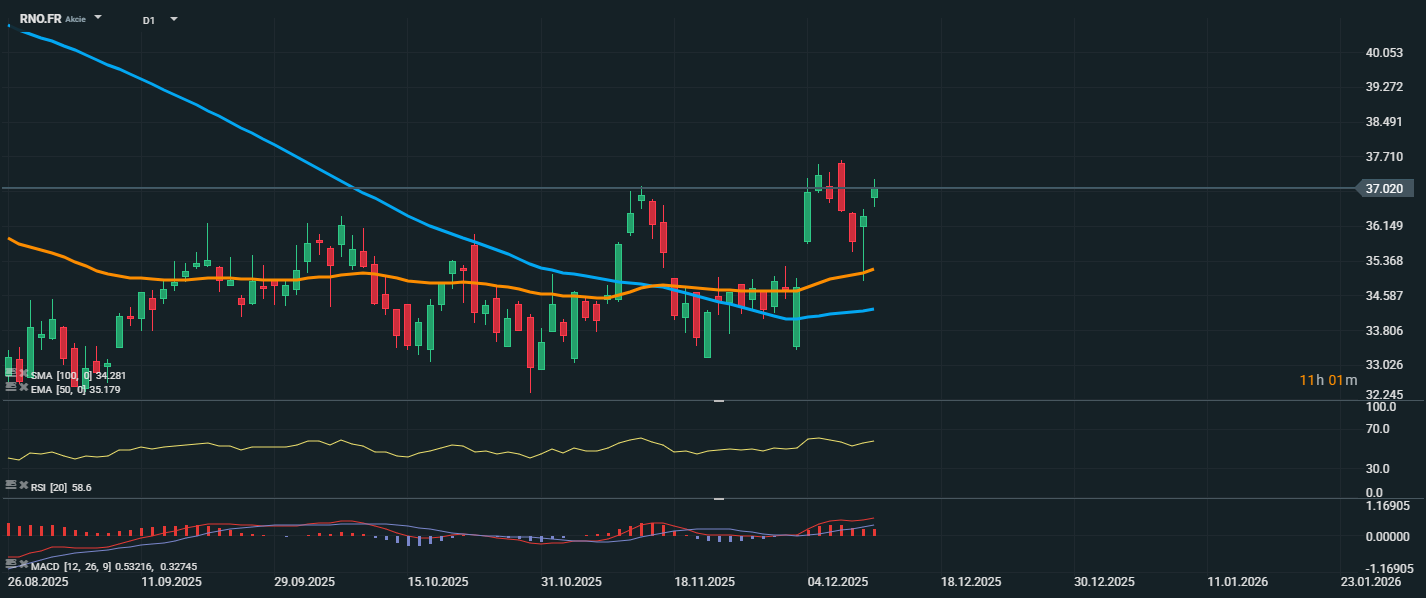 Akcie společnosti Renault se aktuálně obchodují za 37,02 EUR, přičemž v posledních týdnech zaznamenaly výrazné oživení. Cena prorazila nad důležité technické úrovně a drží se nad klouzavými průměry EMA 50 (35,18 EUR) a SMA 100 (34,28 EUR), což je pozitivní signál pro býčí výhled. RSI se aktuálně nachází na hodnotě 58,6, což ukazuje na zdravé nákupní momentum bez známek překoupenosti.