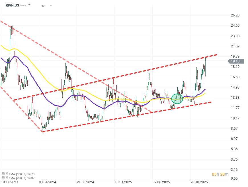 Společnost dnes posílila přibližně o 16 %, a to díky včerejšímu oznámení přelomového produktu. Podle vedení Rivianu jejich nový vlastní procesor pro autonomní řízení, RAP1, nabízí výkon několikanásobně vyšší než u lídrů trhu, jako je Tesla. Řešení má být zároveň 50krát efektivnější než současné standardní procesory, které Rivian používá.