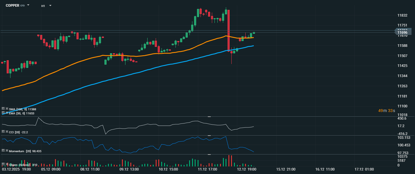 Cena mědi ukazuje po prudkém růstu a následném propadu známky stabilizace. Aktuálně se měď obchoduje na úrovni 11 696 USD, přičemž dochází k postupnému zotavení z hlubokého výprodeje, který nastal po dosažení lokálního maxima. Z technického pohledu cena prorazila pod EMA 50 (11 653 USD) i SMA 100 (11 588 USD), ale následně se opět vrátila zpět nad tyto klouzavé průměry. To signalizuje, že kupci si nadále udržují iniciativu a výprodej byl pravděpodobně jen krátkodobou korekcí v rámci jinak pozitivního trendu. Momentum se nachází na hodnotě 98,4, což naznačuje přetrvávající, byť mírně zpomalující růstové momentum. CCI je s hodnotou -22,2 v blízkosti neutrální oblasti, což značí, že trh není ani překoupený, ani přeprodaný. Objem obchodů během propadu prudce vzrostl, ale aktuální svíčky ukazují na návrat k normálu a stabilizaci.