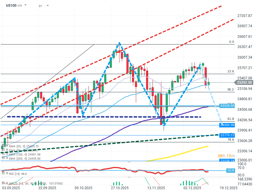 Oceňování na technologickém indexu nadále naplňuje formaci RGR. Dnešní seance je dalším pokusem o její negaci. Klíčovou úrovní pro kupce je 26 000 bodů a FIBO 23,6. Tyto hladiny musí být překonány, aby byla formace zneplatněna. Naopak prodejci musí stlačit cenu minimálně k úrovni výstřihu formace – přibližně 24 200 bodů, aby měli šanci na její naplnění.