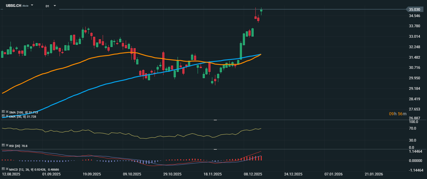 Akcie UBS Group AG v posledních dnech pokračují v dynamickém růstu a aktuálně se obchodují na úrovni 35,03 CHF. Technicky se akcie nacházejí výrazně nad oběma klouzavými průměry – EMA 50 (31,73 CHF) i SMA 100 (31,71 CHF) – což potvrzuje silné býčí nastavení trhu. Klouzavé průměry zároveň míří vzhůru, čímž podporují další růstový trend. RSI dosáhlo hodnoty 70,8, což naznačuje, že trh vstupuje do překoupeného pásma. To může signalizovat možné krátkodobé zpomalení růstu nebo konsolidaci, ale v rámci silného býčího trendu se jedná spíše o potvrzení momenta než jednoznačné varování.
