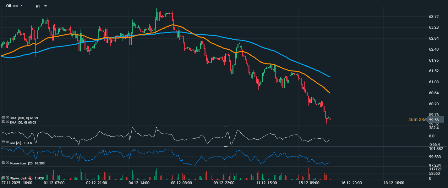Cena ropy pokračuje v intenzivním sestupném trendu a klesla až k úrovni 59,32 USD za barel, tedy pod klíčovou psychologickou hranici 60 USD, kterou trh naposledy testoval v květnu 2025. Tento pokles je potvrzen jak proražením pod klouzavé průměry, tak silnými hodnotami technických indikátorů. Klouzavé průměry EMA 50 (60,63 USD) a SMA 100 (61,29 USD) směřují dolů a cena se drží hluboko pod nimi, což potvrzuje přítomnost silného medvědího trendu. Každý pokus o růst je aktuálně rychle prodáván, což značí dominanci prodejců. CCI dosahuje extrémně nízké hodnoty -131,5, což značí hluboce přeprodaný trh. To naznačuje možnost krátkodobé technické korekce nebo konsolidace, ale bez zásadní změny trendu. Momentum zůstává nízko, i když se v posledních hodinách začíná mírně zvedat, což může značit první náznaky zpomalování tempa poklesu. Objemy zůstávají relativně zvýšené, což potvrzuje aktivitu na trhu během výprodejové fáze.