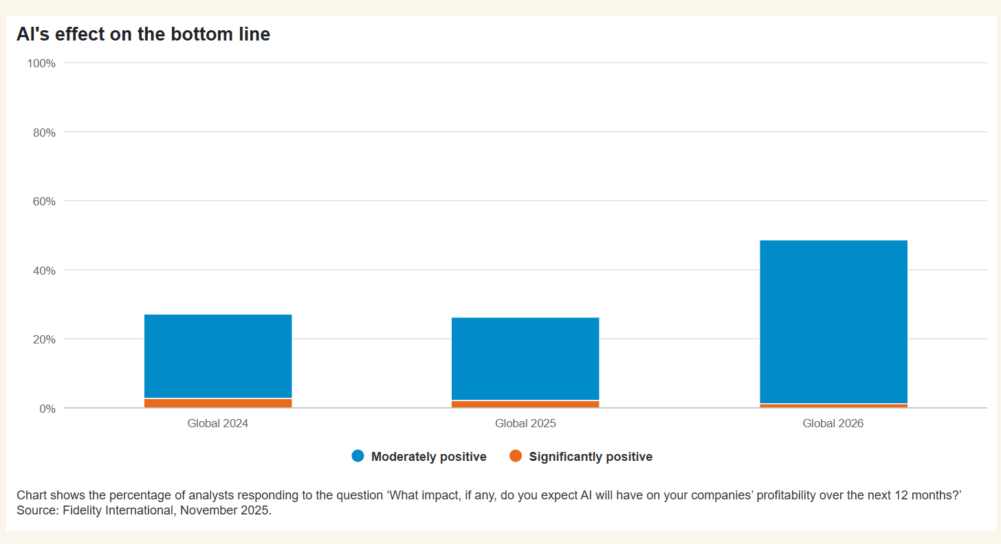 Graf znázorňuje procento analytiků, kteří odpověděli na otázku „Jaký vliv, pokud vůbec nějaký, očekáváte, že bude mít AI na ziskovost vašich společností v příštích 12 měsících?“ Zdroj: Fidelity International, listopad 2025.