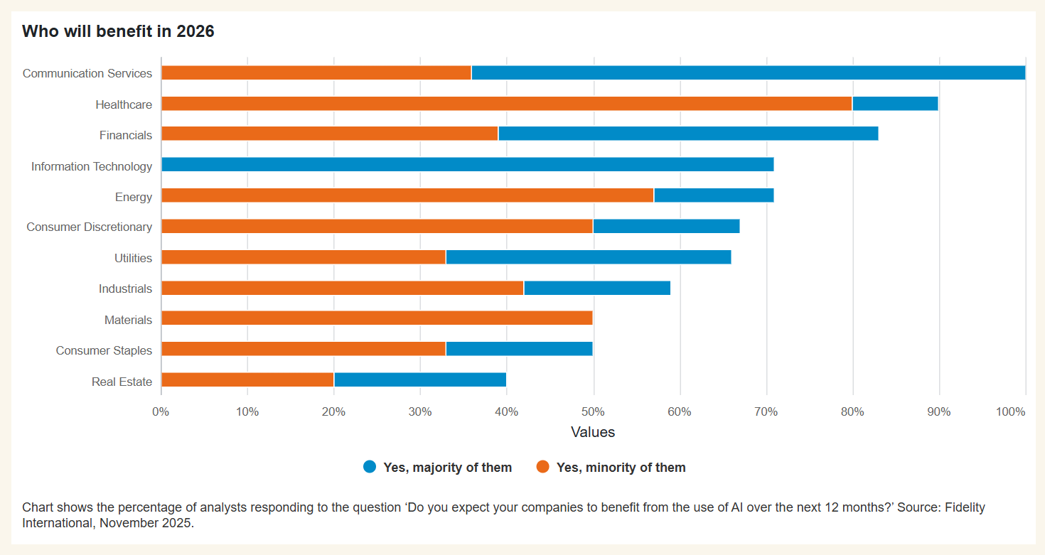 -Ano, menšina z nich. Graf zobrazuje procentní podíl analytiků, kteří odpověděli na otázku „Očekáváte, že vaše společnosti budou v příštích 12 měsících těžit z využití AI?“ Zdroj: Fidelity International, listopad 2025.