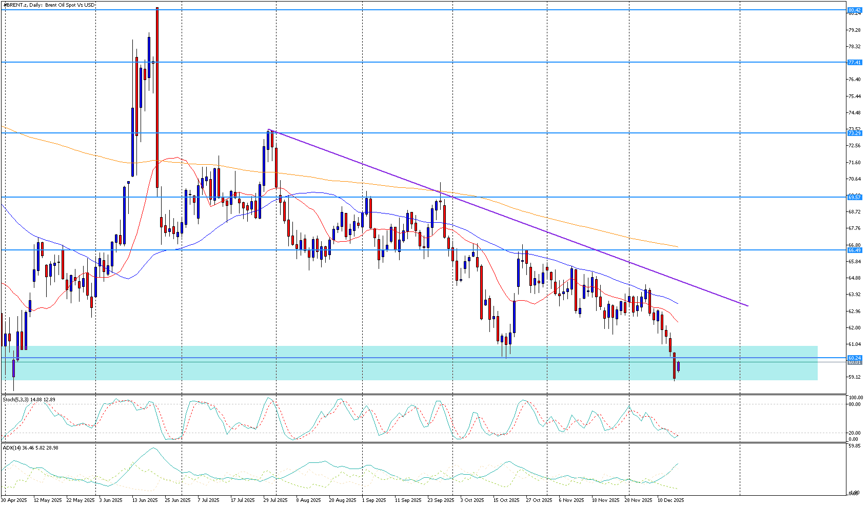 Futures na ropu BRENT pokračují v poklesu a navazují tak na ztráty z posledních čtyř obchodních seancí, které již přesáhly 5 %. Prodejní tlak se výrazně zvýšil poté, co cena prudce odmítla oblast 20denního jednoduchého klouzavého průměru poblíž 62,00 USD. Aktuální oslabení přichází v prostředí rostoucích spekulací o možné mírové dohodě mezi Ruskem a Ukrajinou, která by mohla vést k částečnému uvolnění sankcí a zvýšit obavy z přebytku nabídky na globálním ropném trhu. Cena se nyní pohybuje poblíž lokálního minima na úrovni 59,93 USD a technické indikátory potvrzují převahu prodejců. RSI klesá směrem k hranici 30, což signalizuje blížící se přeprodané podmínky, zatímco MACD zůstává hluboko pod nulovou i signální linií a nadále ukazuje na silné medvědí momentum. Pokud tlak na pokles přetrvá, ropa BRENT by mohla zamířit ke čtyřletému minimu kolem 58,20 USD, které bylo naposledy testováno v září a může představovat první významnější technickou oporu. Průlom pod tuto hladinu by otevřel prostor k mnohem hlubším ztrátám, přičemž další výrazná podpůrná oblast se nachází v pásmu 52,10–53,50 USD, kde se cena stabilizovala na začátku roku 2021. Naopak návrat nad úroveň 60,24 USD by mohl dočasně zmírnit prodejní tlak a umožnit boční konsolidaci směrem k oblasti 62,20–63,60 USD, kde se sbíhají 20denní a 50denní SMA. Teprve průlom nad tuto zónu by naznačil návrat kupců a otevřel cestu k maximu z konce října poblíž 66,50 USD, těsně pod 200denním SMA.