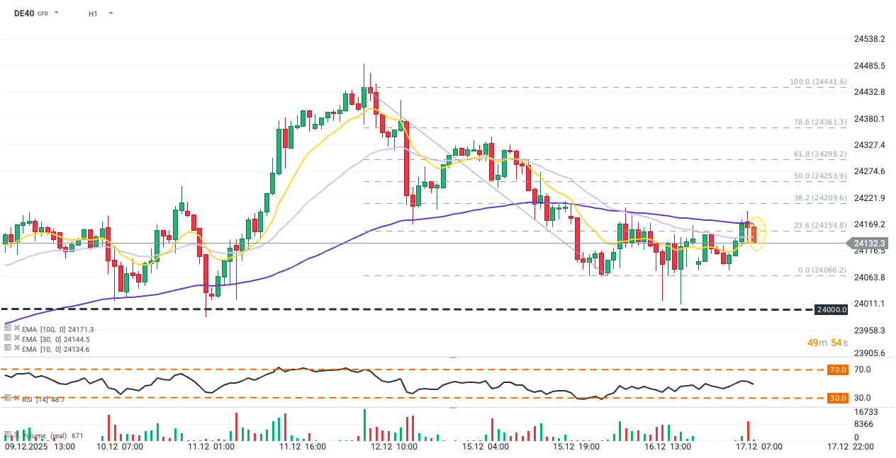 Futures na index DAX se odrazily od EMA100 v intervalu H1 a klesly pod úroveň 23,6 Fibonacciho retracementu po neočekávaném poklesu indexů podnikatelského sentimentu zveřejněných německým institutem Ifo.
