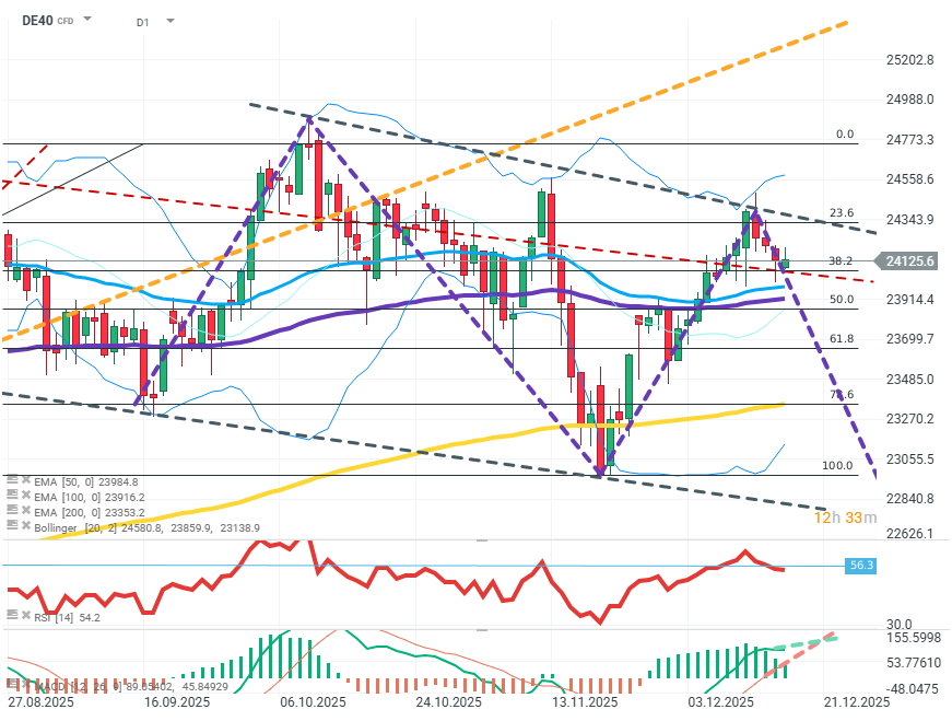 Dnešní seance na německém akciovém trhu byla ve znamení výrazných změn ve složení indexu DAX. Největší událostí bylo oznámení, že společnost Porsche AG opustí benchmark po pouhých třech letech od vstupu na burzu. Společnost se potýkala s kombinací amerických cel, slábnoucí poptávky po elektromobilech a klesajícími prodeji v Číně. v současné době většina evropských indexů zaznamenává minimální zisky. Lídry růstu jsou aktuálně NED25 a AUT20 s přírůstky kolem 0,2 %. Indexy ITA40 a SPA35 ztrácejí přibližně 0,1 %. DE40 zůstává poblíž otevírací úrovně.