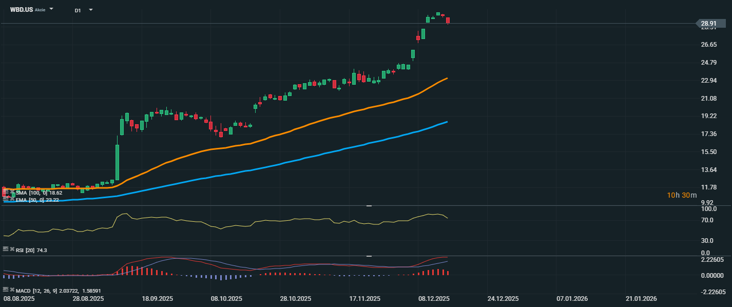 Akcie společnosti Warner Bros Discovery (WBD.US) pokračují v silném růstovém trendu a aktuálně se obchodují na ceně 28,91 USD. Cena se výrazně vzdálila od obou klouzavých průměrů – EMA 50 na úrovni 23,22 USD a SMA 100 na úrovni 18,62 USD – což potvrzuje silné býčí momentum. RSI dosahuje hodnoty 74,3, což značí, že akcie se nachází v překoupeném pásmu, a může tak krátkodobě dojít ke konsolidaci nebo mírné korekci.