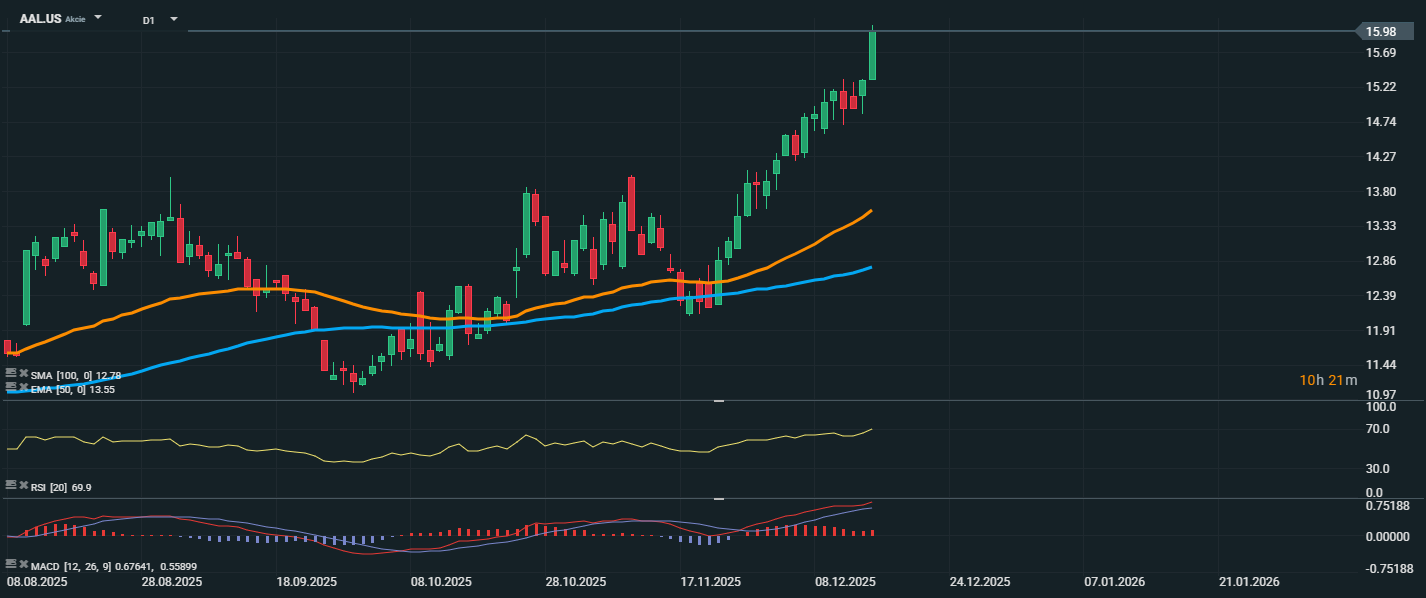 Akcie společnosti American Airlines aktuálně vykazují silný růstový trend, když během prosince prudce posílily a nyní se obchodují na úrovni 15,98 USD, což představuje několikaměsíční maximum. Cena se výrazně odrazila od technických úrovní a nachází se nad klouzavými průměry EMA 50 (13,55 USD) i SMA 100 (12,78 USD). Tato situace potvrzuje býčí nastavení trhu a pokračující pozitivní momentum. RSI dosahuje hodnoty 69,9, tedy je těsně pod hranicí překoupenosti, což naznačuje, že trh je silně podporován kupci, ale prostor pro další růst může být krátkodobě omezen.